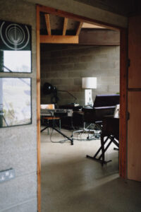 The studio reworks a garage space set at a lower level; the aim was to work with simple, economic and honest materials – concrete block, timber joists, steelwork expressed and put together in an interesting way to form a dynamic space hooked around acoustic principles.